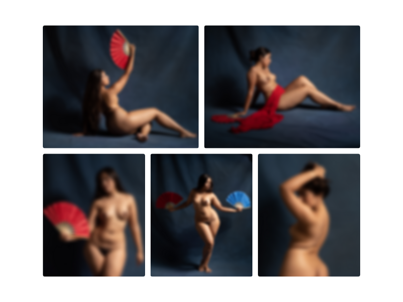 The poses are set against a deep blue handpainted backdrop and incorporate gorgeous contrasting props such as hand fans and a linen drape.