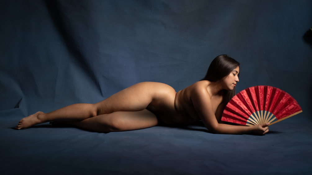 The poses are set against a deep blue handpainted backdrop and incorporate gorgeous contrasting props such as hand fans and a linen drape.